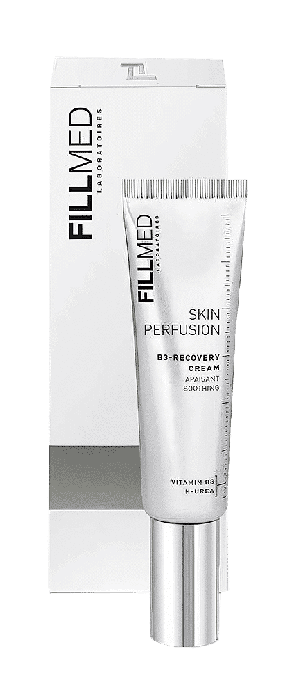 FILLMED Skin Perfusion B3 Recovery Cream restores the skin’s moisture barrier, strengthens the epidermis, and enhances its natural healing process. This soothing aftercare solution for aesthetic procedures includes hydrating properties to shield sensitive and reactive skin from external aggressors. Vitamin B3 promotes collagen synthesis and fortifies the skin barrier.