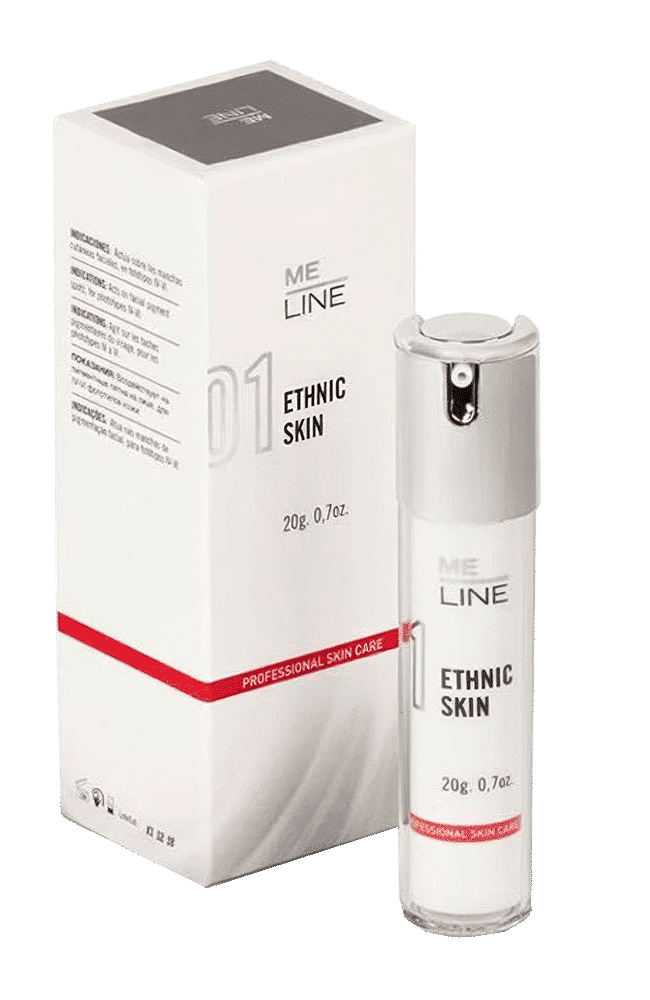 ME Line 01 Treatment for Ethnic Skin is designed to address melasma, hyperpigmentation, and chloasma in patients with phototype IV-VI skin. Its active ingredients work synergistically to exert strong control and inhibition over melanin synthesis, intervening in pre-synthesis processes. They directly inhibit the tyrosinase enzyme, promote degranulation of intra-keratinocyte pigments, and enhance epidermal turnover and removal of pigmented cells.